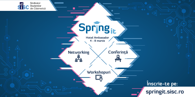 Sindicatul Studenților din Facultatea de Cibernetică, Statistică și Informatică Economică (SiSC) aduce în prim plan cea de-a VIII-a ediție a proiectului Spring IT. Cea mai veche organizație studențească din cadrul Academiei de Studii Economice din București, SiSC (www.sisc.ro), se mândrește cu peste 200 de proiecte finalizate cu succes, care au influențat în mod pozitiv dezvoltarea profesională și personală a studenților.